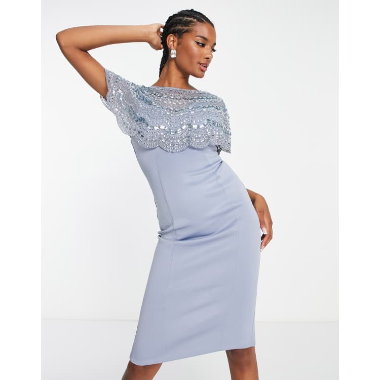 Product Item: Dusty blue lace hot sale ruffle detail midi dress